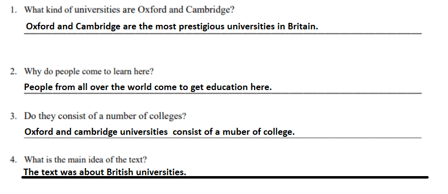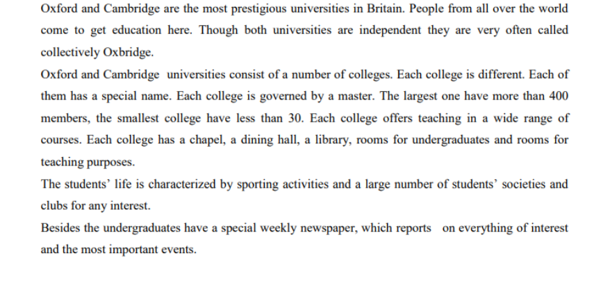 Օքսֆորդը և Քեմբրիջը Բրիտանիայի ամենահեղինակավոր համալսարաններն են: Աշխարհի տարբեր ծայրերից մարդիկ գալիս են այստեղ կրթություն ստանալու: Թեև երկու համալսարաններն էլ անկախ են, դրանք շատ հաճախ անվանում են հավաքական Օքսբրիջ: Օքսֆորդի և Քեմբրիջի համալսարանները բաղկացած են մի շարք քոլեջներից: Յուրաքանչյուր քոլեջ տարբեր է: Նրանցից յուրաքանչյուրն ունի հատուկ անուն: Յուրաքանչյուր քոլեջ կառավարվում է վարպետի կողմից: Ամենամեծն ունի ավելի քան 400 անդամ, ամենափոքր քոլեջը 30 -ից պակաս։ Յուրաքանչյուր քոլեջ առաջարկում է ուսուցում դասընթացների լայն շրժանակում։ Յուրաքանչյուր քոլեջ ունի մատուռ, ճամասենյակ, գրադարան , սենյակներ և սենյակներ ուսուցման համար։ Ոսանողների կյանքը բնութագրվում է սպորտային գործունեությամբ և մեծ թվով ուսանողների հասարակություներով և ակումբներով։ Ցանկացած հետաքրքրության համար: Բացի բակալավրիատից, կա հատուկ շաբաթաթերթ, որը հաղորդում է հետաքրքրություն ներկայացնող և կարևոր իրադարձությունների մասին:
